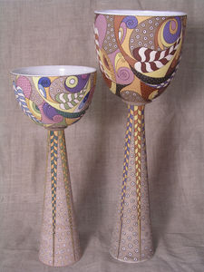 Створює декоративну пластику та скульптури, вази, тарелі, ужитковий та декоратинний посуд.